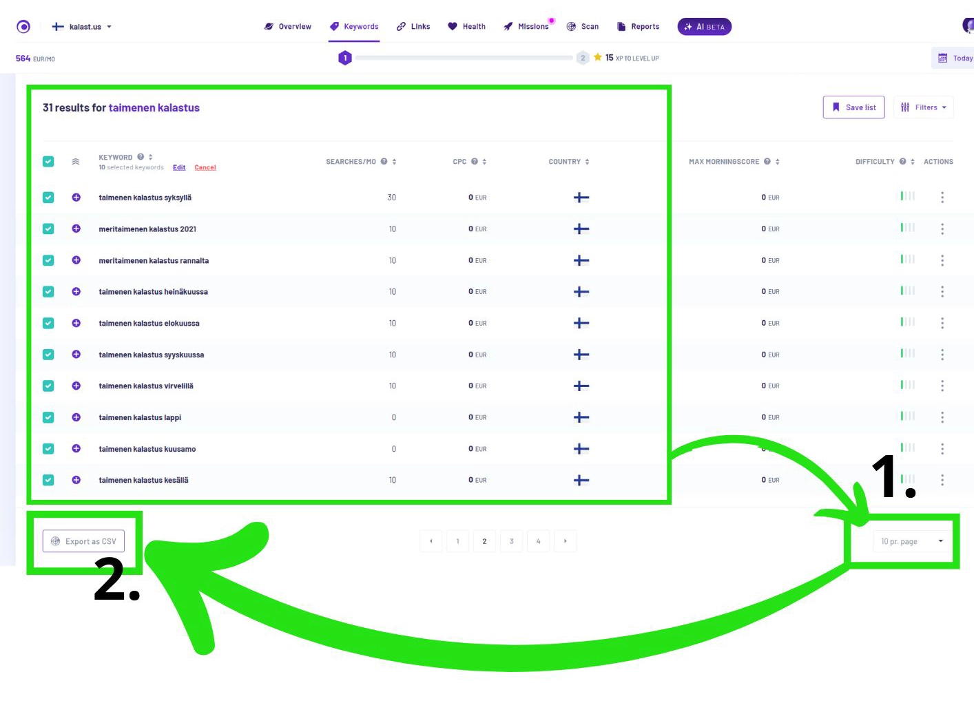 Näin saat tiedon sivustosi nykytilanteesta ja avainsanoista, joilla pärjäät. Jos huomaat, että sivustosi ei näy liiketoiminnallesi tärkeillä avainsanoilla, on aika suunnitella niille SEO-strategia. Samoin jos huomaat, että sinulla on sijoituksia, mutta niitä voisi parantaa, voit hyödyntää äsken lataamiasi avainsanoja SEO-työn tukena.