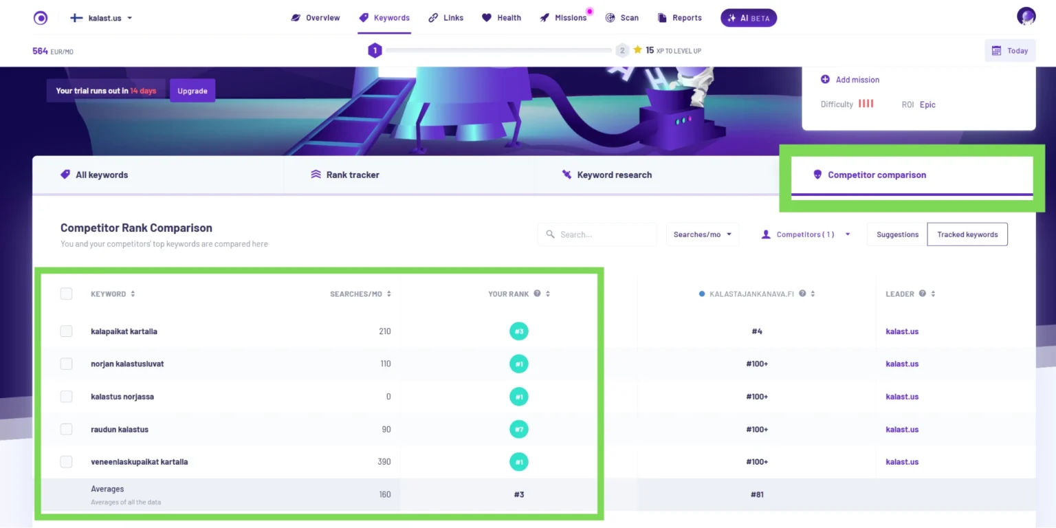 Tämän jälkeen vieritä ylemmäs sivua ja klikkaa valikosta “Competitor comparison” ja näet, miten sijoitut aiemmin valitsemillasi avainsanoilla suhteessa muihin.